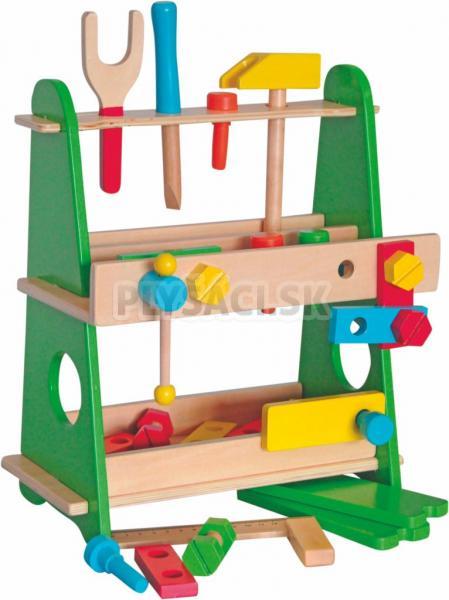 Woody - Pracovný ponk veľký. Je drevené náradie pre deti, ktoré pomáha rozvíjať manuálnu zručnosť dieťaťa. Diely môžete skrutkovať alebo stĺkať dokopy.