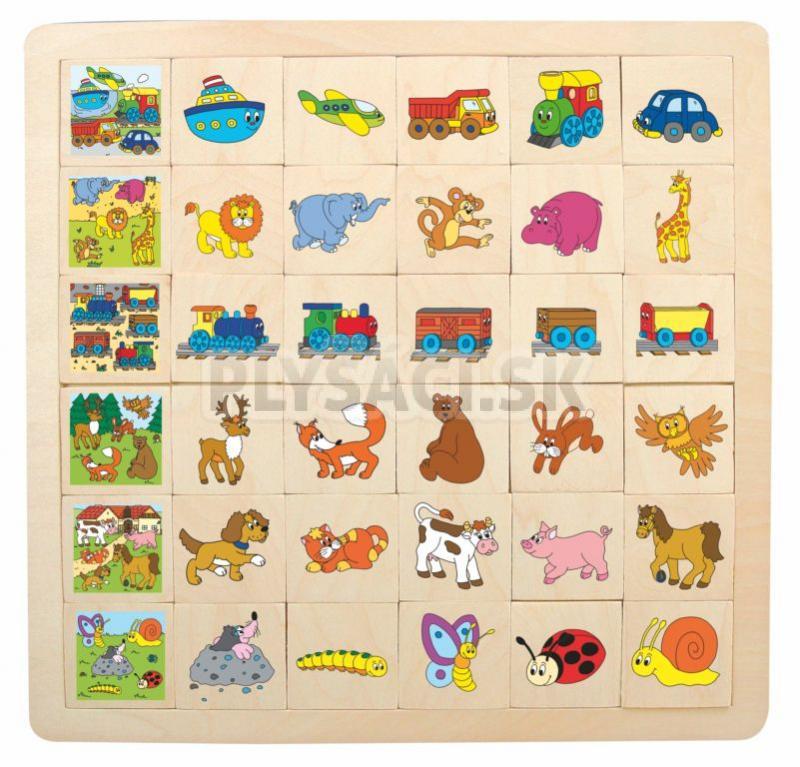 Woody - Prilož, kam čo patrí "Mašinka" (6x6). Hra pozostáva z hracieho rámu na ktoré dieťa vloží hrací kameň s obrázkom a k nemu ďalej vyhľadáva a priraďuje kamene. Dreve…