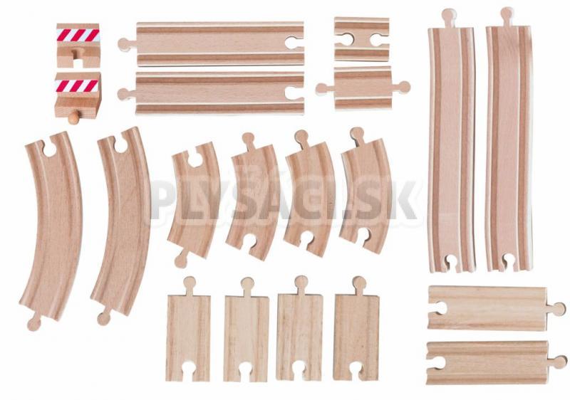 Set obsahuje dvadsať skvele vyrobených drevených dielov, ktoré rozšíria vašu vláčikodráhu. Woody príslušenstvo k dráhe je určené všetkým deťom starším ako 3 roky.