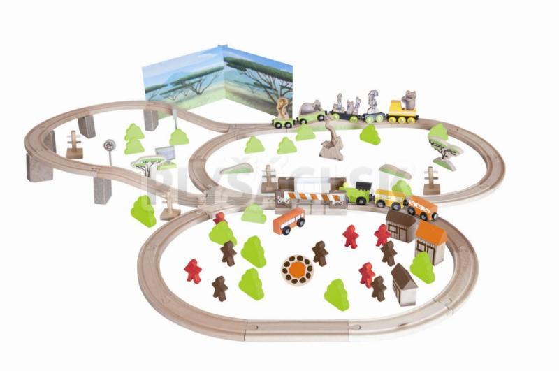 Drevená Vláčikodráha s veselým farebným vláčikom a zvieratkami zavezie deti do prostredia Afriky. Vláčikodráha obsahuje veľa príslušenstva ako je most, príroda, domy a ďalšie.